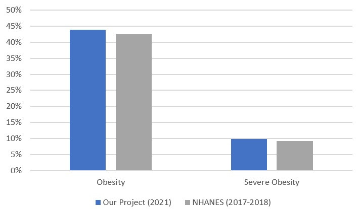 Figure 1. Obesity (BMI>30) and Severe Obesity (BMI>40) Prevalence for Adults in 2021 vs. NHANES 2017-2018