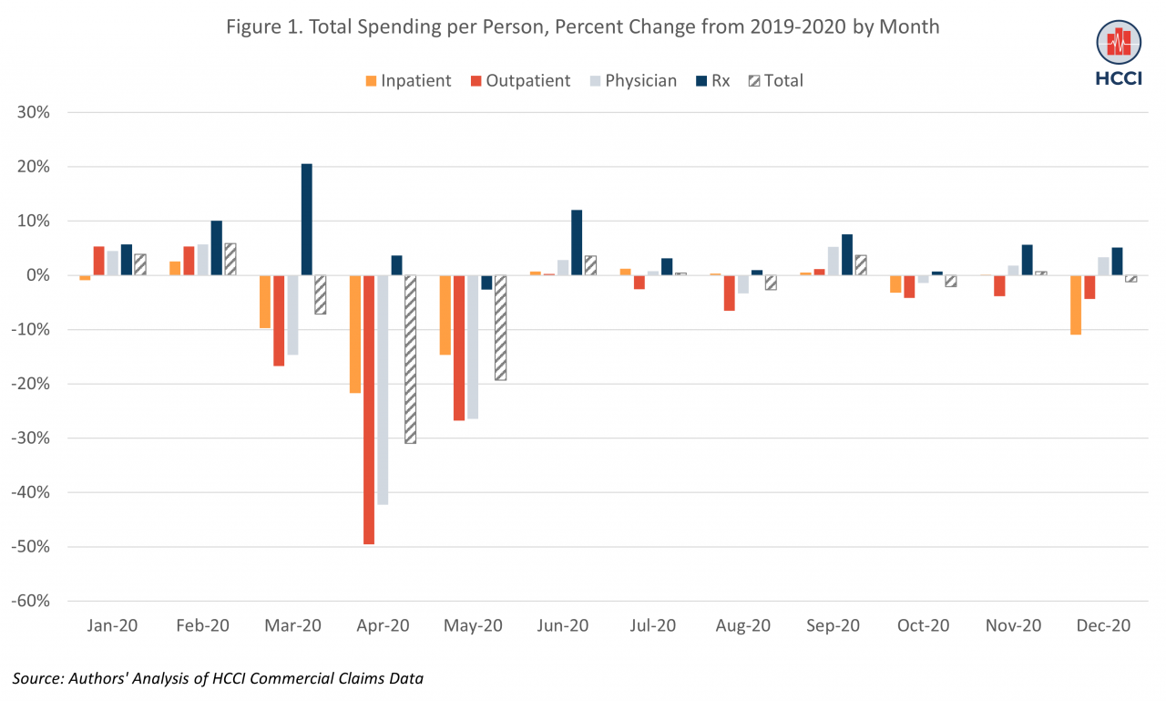 The COVID-19 pandemic was a shock to the health care system; at least one way in which this shock manifested was in a decrease in overall spending and spending in all medical categories of care (inpatient, outpatient, and physician/clinician services) among those with employer-sponsored health insurance in 2020. As shown in our main report, the decline in spending in 2020 was driven by dramatic decreases in use of health care services. As described here, the annual change was driven by declines in spending in the early months of the pandemic as stay-at-home and related regulations were introduced.