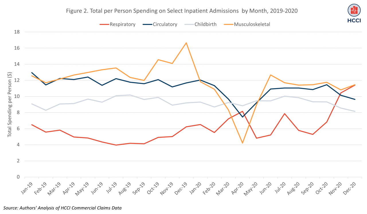 Spending declines were especially large in categories of services where care was more likely to be elective or deferable (though long-term spending and clinical outcomes of this skipped/deferred care remain to be seen). For example, we looked at monthly per person spending on hospital admissions for musculoskeletal, circulatory, childbirth, and respiratory services (Figure 2). These categories of services account for over 40% of inpatient spending in 2020.