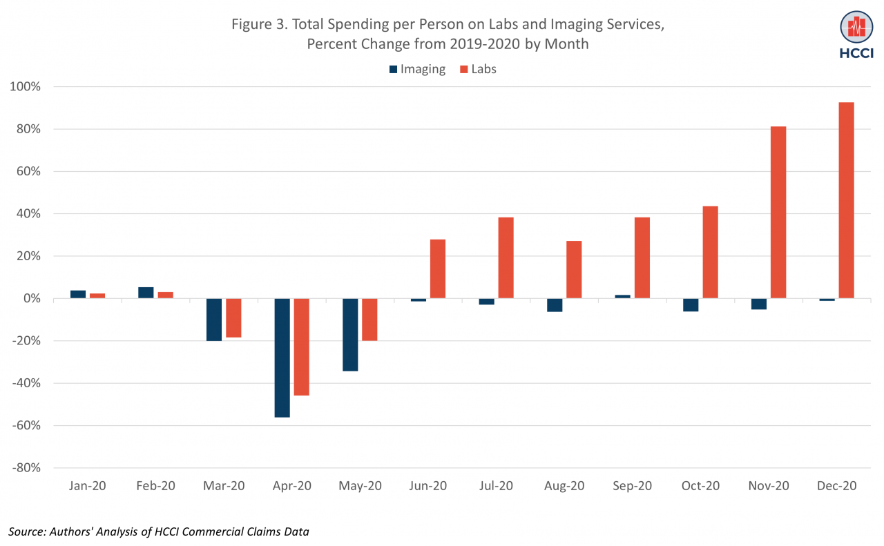 By June, however, spending on labs was 28% higher than in June of 2019, and by December, it was over 90% higher than in the same month in 2019. These trends reflect the increase in use of COVID testing over the year, as documented in other HCCI work. In contrast to lab services, spending on office-based imaging services, which typically require an in-person physician visit, and may be perceived as deferrable, was 56% lower in April 2020 than April of 2019. Like other non-COVID related services, use of imaging rebounded to reach comparable levels to 2019 by June 2020.