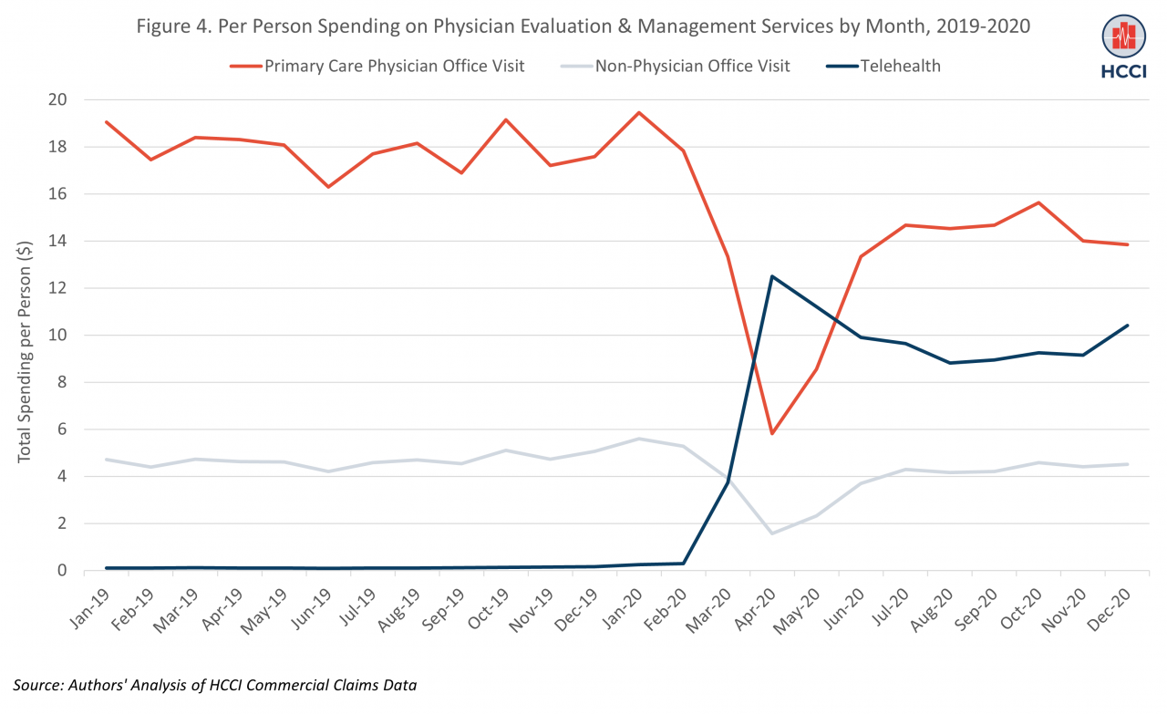 We observe price increases across nearly all categories of care in 2020. In some categories, prices reflect a change in service mix due to COVID. For example, the average price of a lab test increased 28% in 2020 after decreasing in 2018 and 2019, even as use of lab tests fell 5%. This increase in price was due to an increase in provision of COVID-19 tests, which are higher priced than most lab services (i.e., a COVID-induced shift in service mix within the lab category towards more expensive services). In other cases, price increases are a direct result of changes in payment policy. An example of this is the 85% increase in telehealth prices from 2019-2020, driven by an increase in reimbursement for these services across payers. In other cases, prices may be a function of market dynamics independent of COVID.