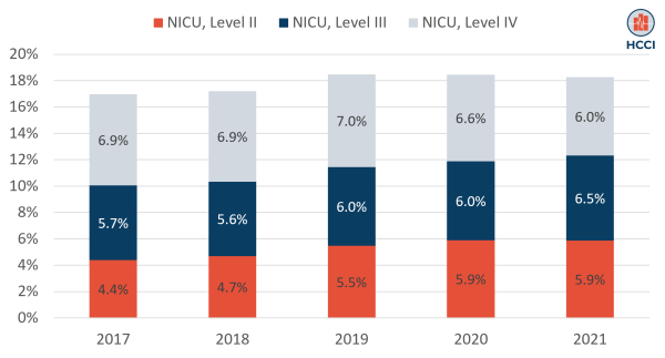 Figure 1. Share of Newborns Receiving NICU Care, by Highest Level of Care (2017-2021)