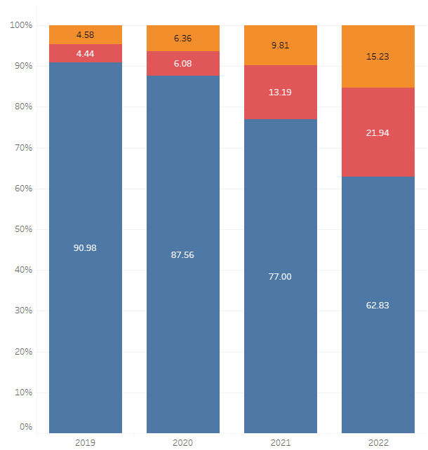 To understand the extent to which Ozempic and Rybelsus are prescribed off-label, either to treat obesity or other conditions, we stratified users by the presence of a diabetes diagnosis, obesity diagnosis without diabetes, or neither diagnosis. We found that in 2022, only 63% of Ozempic users had a documented diabetes diagnosis, down from 91% in 2019, a 31% decrease. As the proportion of Ozempic users with a diabetes diagnosis decreased, the proportion of users with an obesity diagnosis increased from 4% in 2019 to 22% in 2022, and the proportion of users without either a diabetes or obesity diagnosis increased from 5% in 2019 to 15% in 2022.