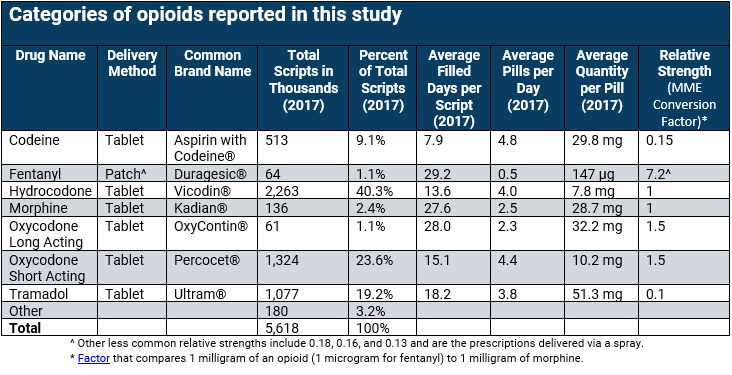 The three opioids with the greatest utilization in 2017 were hydrocodone, oxycodone short acting, and tramadol (Figure 2). In addition, oxycodone long acting saw significant changes in use.