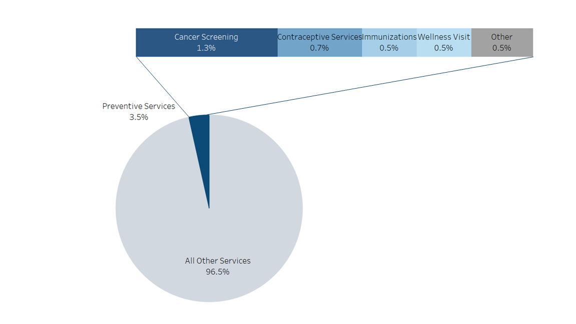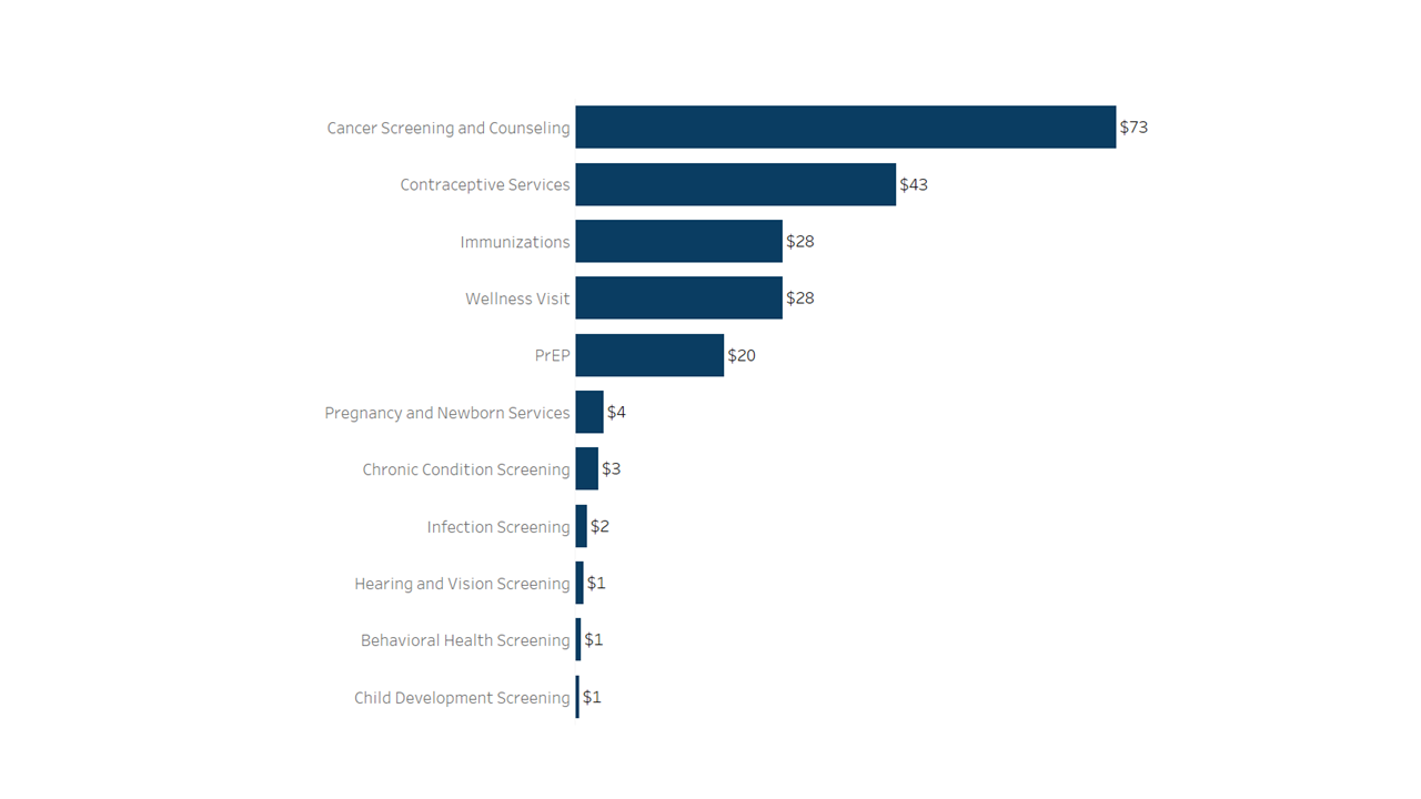 Of the no-cost preventive services, cancer screening made up the largest portion of total spending (1.3%), followed by contraceptive services (0.7%), immunizations (0.5%), and wellness visits (0.5%) (Figure 1). The remaining 0.5% was spent on all other preventive services combined. The graph below shows the $204 cost broken down by service category.